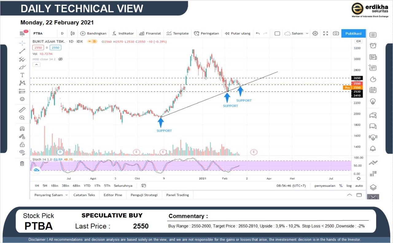 SPECULATIVE BUY PTBA (2550). Buy Range : 2550-2600, Target Price : 2650-2810, Upside : 3,9% - 10,2%. Stop Loss < 2500 ,Downside : -2%... Read more