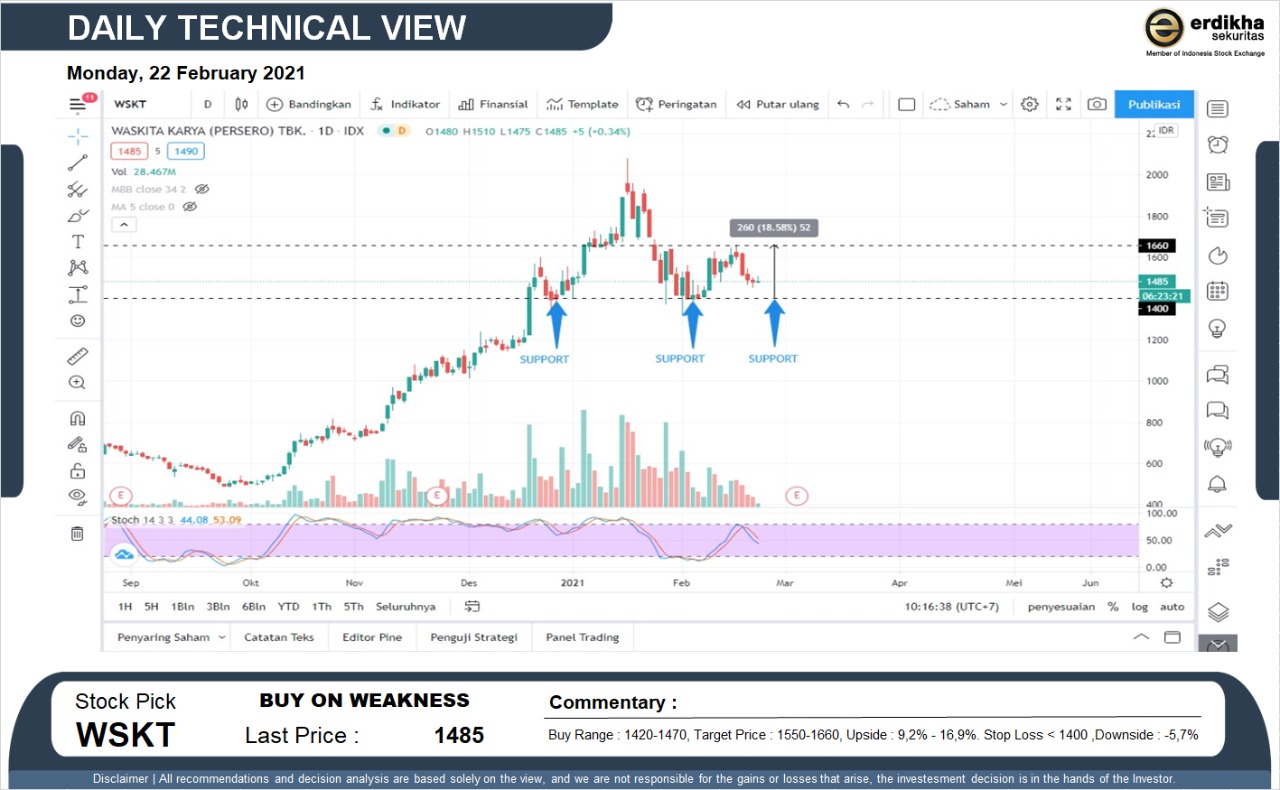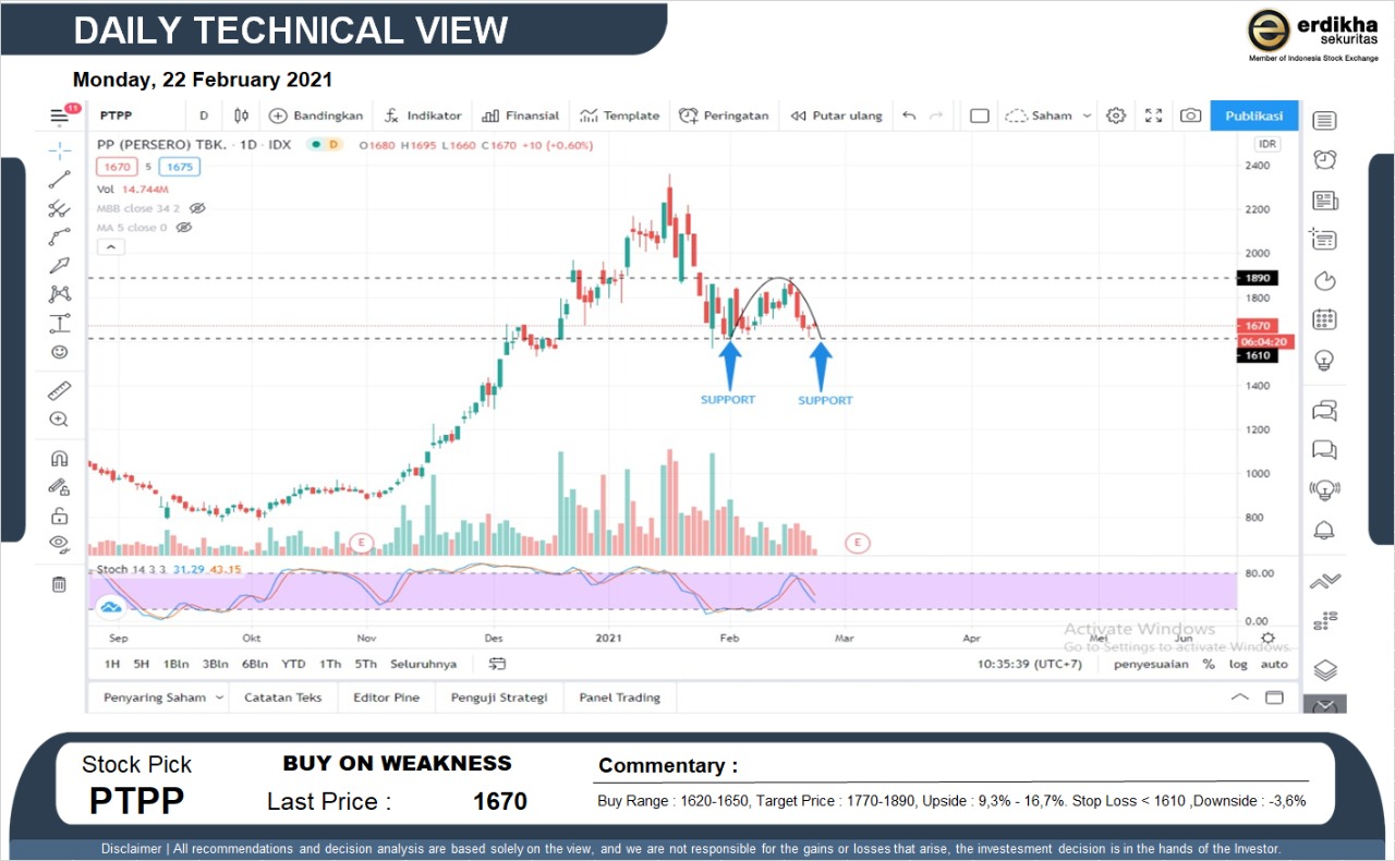 BUY ON WEAKNESS PTPP (1670). Buy Range : 1620-1650, Target Price : 1770-1890, Upside : 9,3% - 16,7%. Stop Loss < 1610 ,Downside : -3,6%... Read more